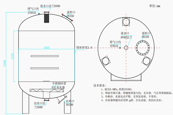 機(jī)械過(guò)濾器整體內(nèi)部結(jié)構(gòu)SUS304不銹鋼材質(zhì)罐體,濾料層,進(jìn)出水法蘭,排氣閥,進(jìn)料口,布爪器、反洗排水口、順洗排水口、壓縮空氣進(jìn)口等環(huán)節(jié)組成。